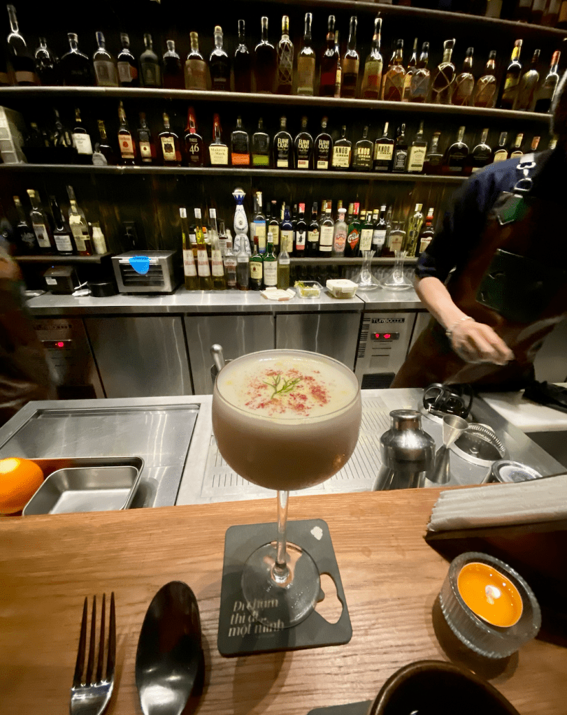 Daring to at once surrender my tastebuds to the weird and wonderful minds behind the Vietnamese-forward concoctions from the bar, I ordered the Atiso Sour without hesitation, as it was a cocktail I had long been wanting to try. Upon closer inspection of the menu, I realised this was quite a bold choice indeed, as it contains several out-there flavours I would pause before putting in a cocktail. Dill, yellow mustard, yoghurt, could it work?