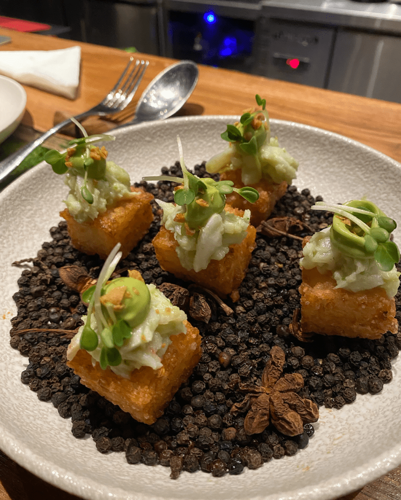 Before I could finish my cocktail, the first small plate of the night swiftly made its way out of the kitchen. Gemination presents: Crispy Rice with Crab Meat, cubes of golden fried rice topped with the delicate meat of fresh crab, sprinkled with moreish green chilli salt and dollops of avocado sauce. Simply delicious.
