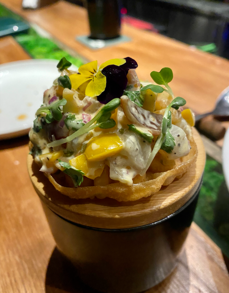 Allow me to introduce the star dish, Hokkaido Japanese Scallops, two ways. A ceramic cup with a wooden lid functions as the vehicle for a mind-blowing scallop and mango-filled tart shell, too good to share even though very much large enough. Beneath, you are beckoned to dig your spoon into a warm and bright green pea puree, accompanied by, you guessed it, more succulent Japanese scallops.