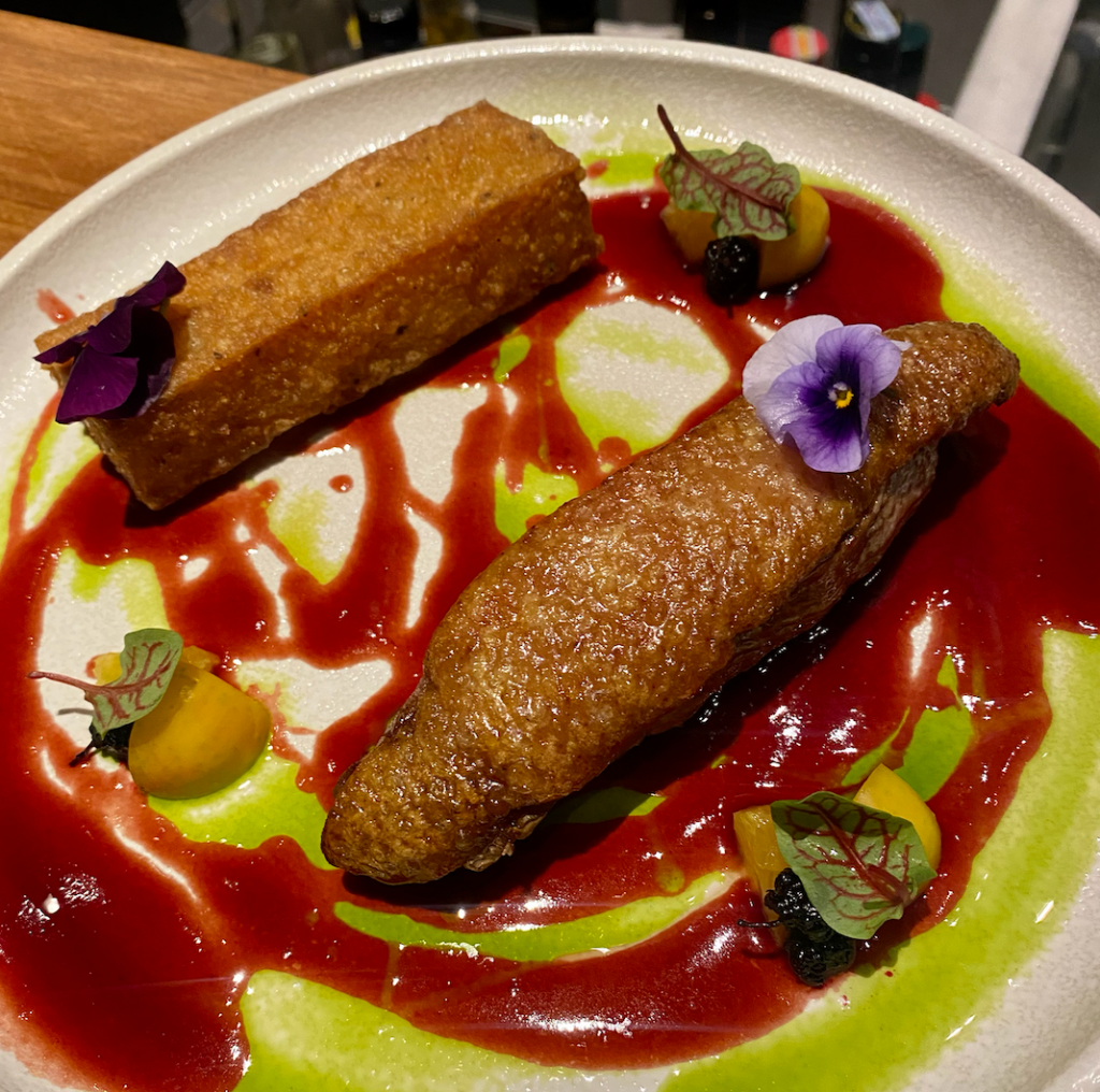 Another dish we were happy to tuck into on the second night was the Duck and Turnip Cake in a berry reduction and herb oil. Strikingly presented, one must take a photo. Perfectly cooked duck is surely a real treat, but the crispy golden turnip cake touched a special place in my heart reserved for the enjoyment of classic dim sum. It made me so happy, I even laughed a little with my mouth full of food.